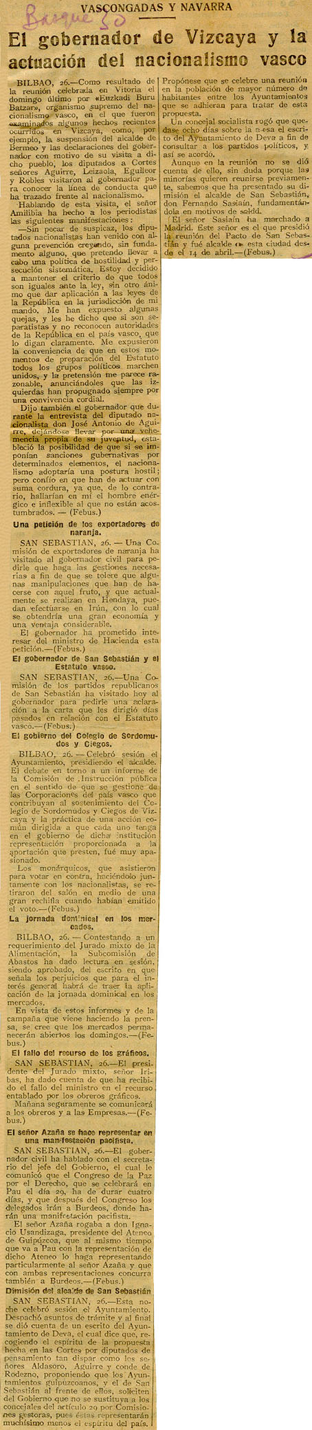 - El gobernador de Vizcaya y la actuación del nacionalismo vasco.