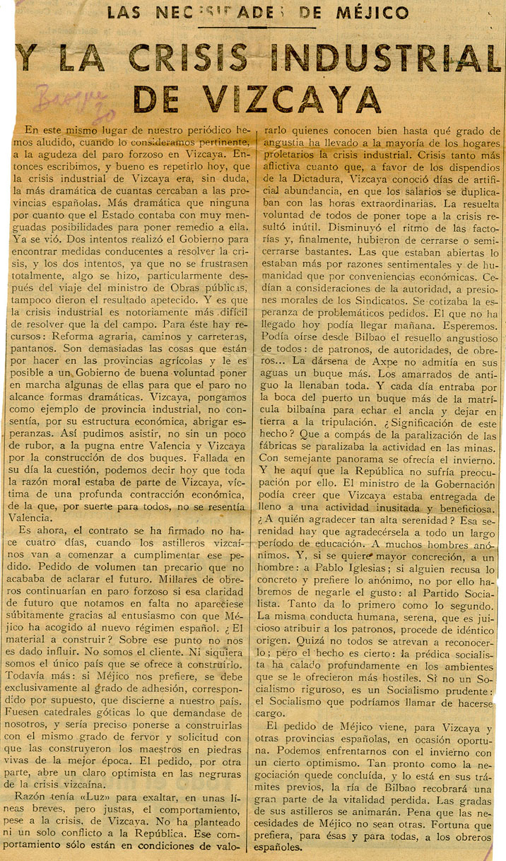 - Las necesidades de Méjico y la Crisis industrial de Vizcaya.