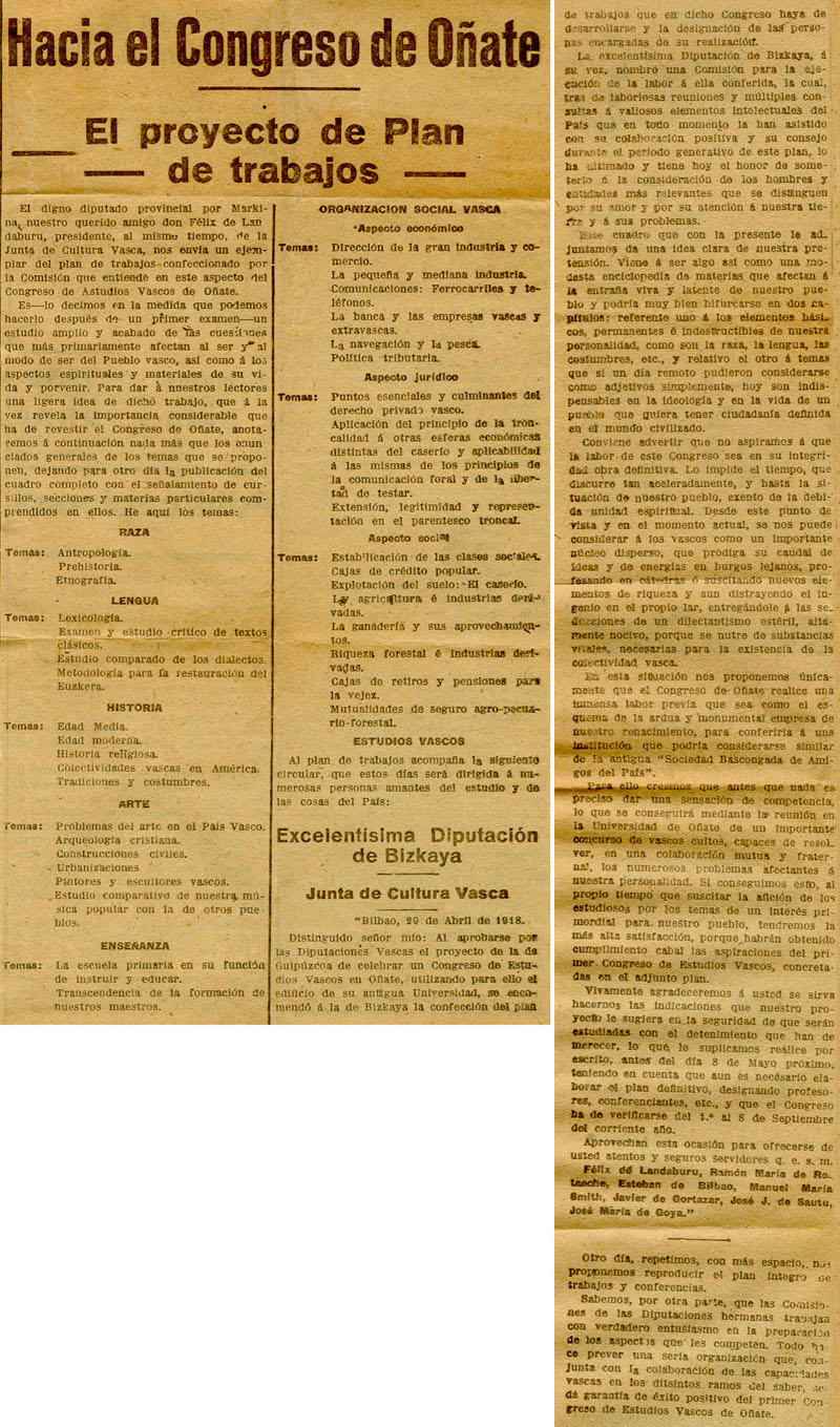- Hacia el Congreso de Oñate. El proyecto de Plan de trabajos.