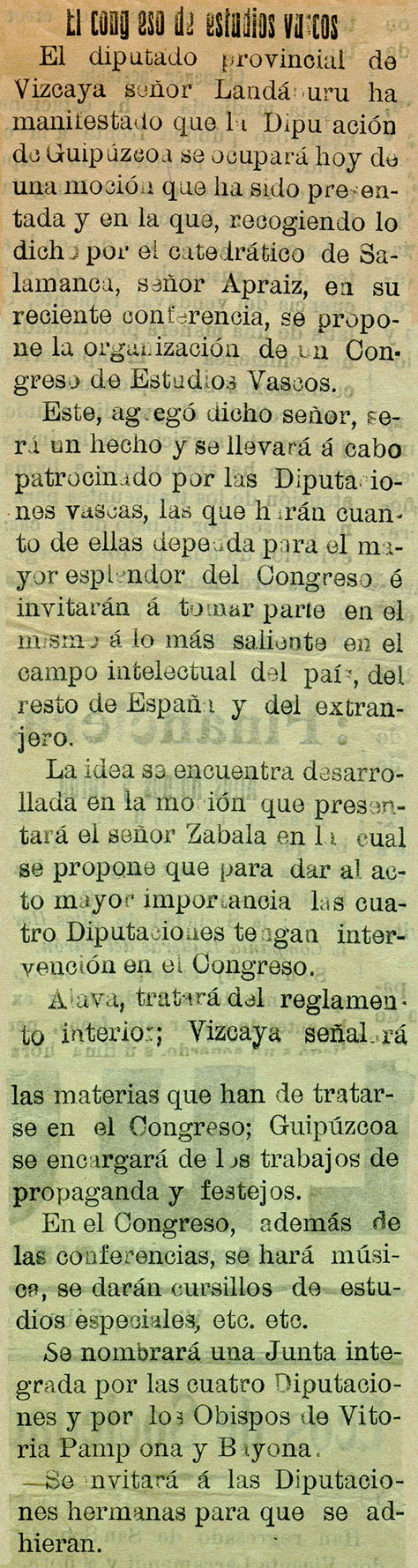 - Sobre proposición de organizar un Congreso de Estudios Vascos manifestada por Apraiz en su reciente conferencia sobre la Universidad Vasca y recogida por la Diputación guipuzcoana. Reparto de tareas por las Diputaciones.