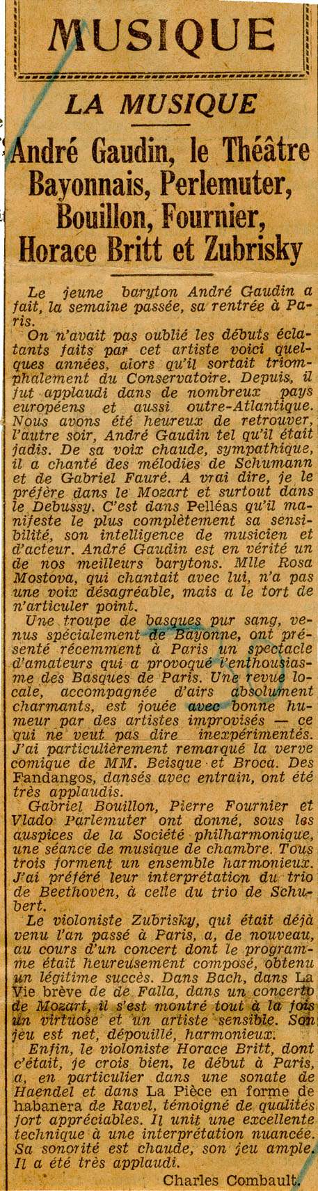 - Musique. La Musique. André Gaudin, le Théâtre Bayonnais, Perlemuter, Bouillon, Fournier, Horace Britt et Zubisky.