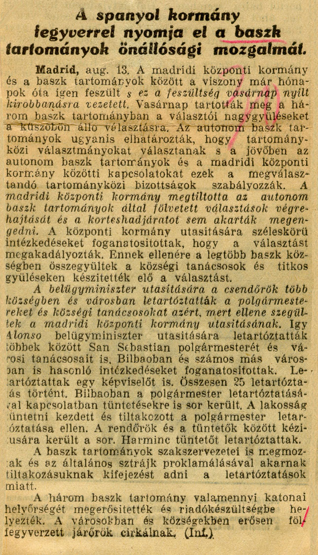 - A spanyol hormány legyverrel nyomja el a baszh fartományok önállósági mozagalmát.
