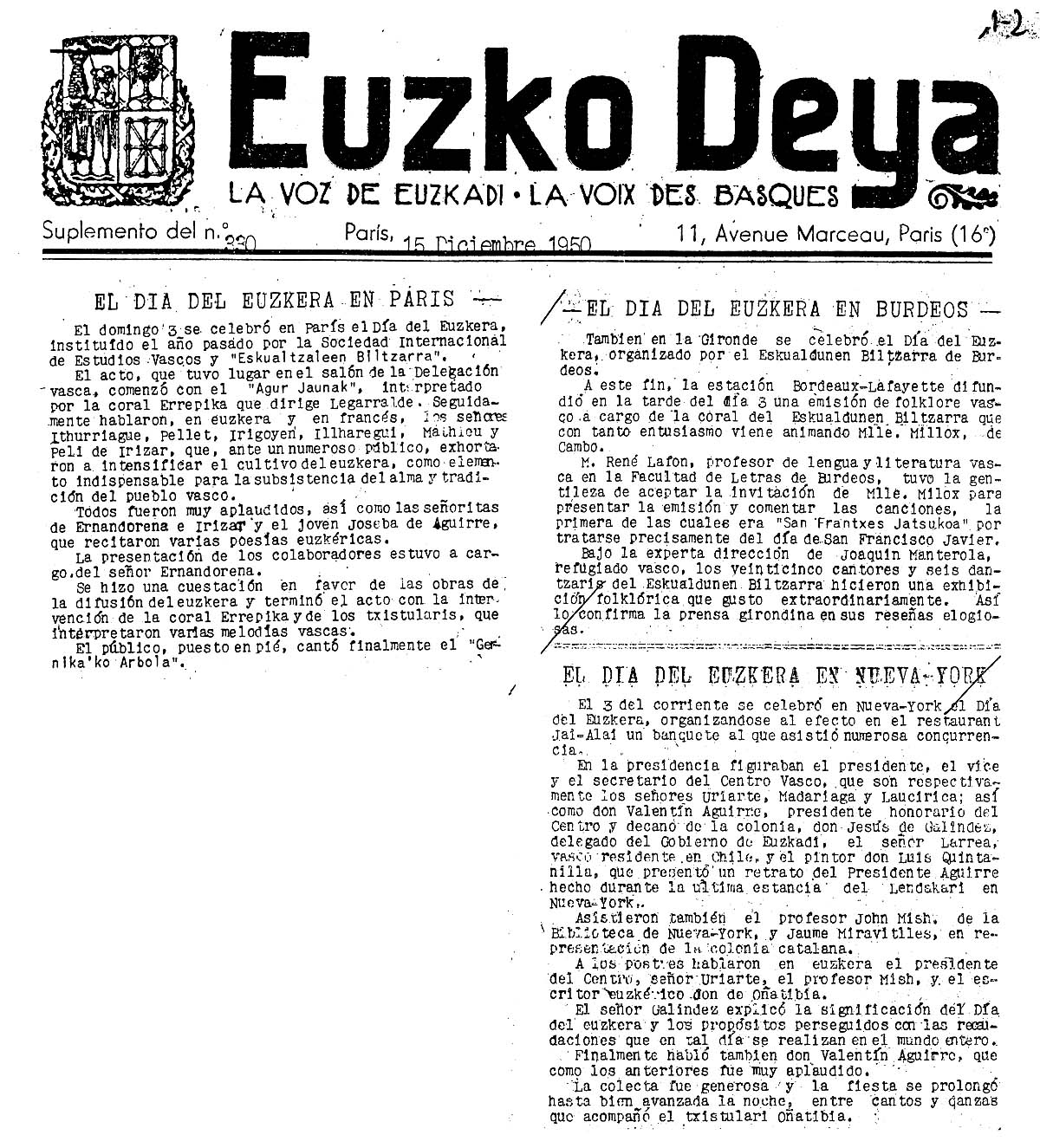 El Día del Euzkera en París / Burdeos / Nueva York