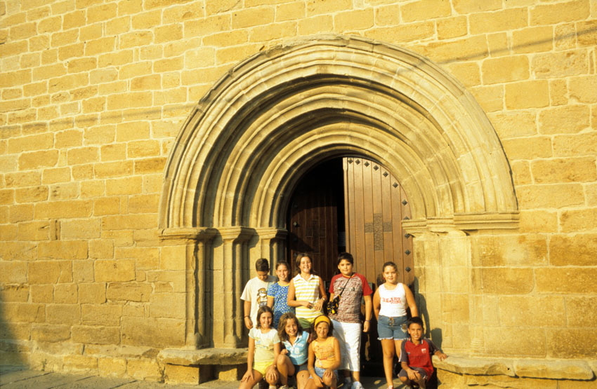 Niños junto a la portada de la Iglesia de Nuestra Señora de la Asunción, en Santacara (Navarra).