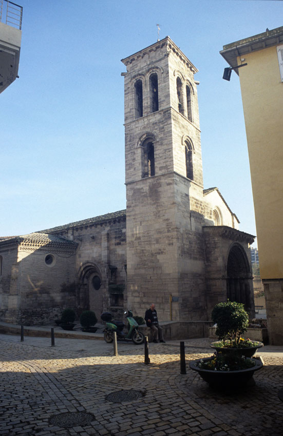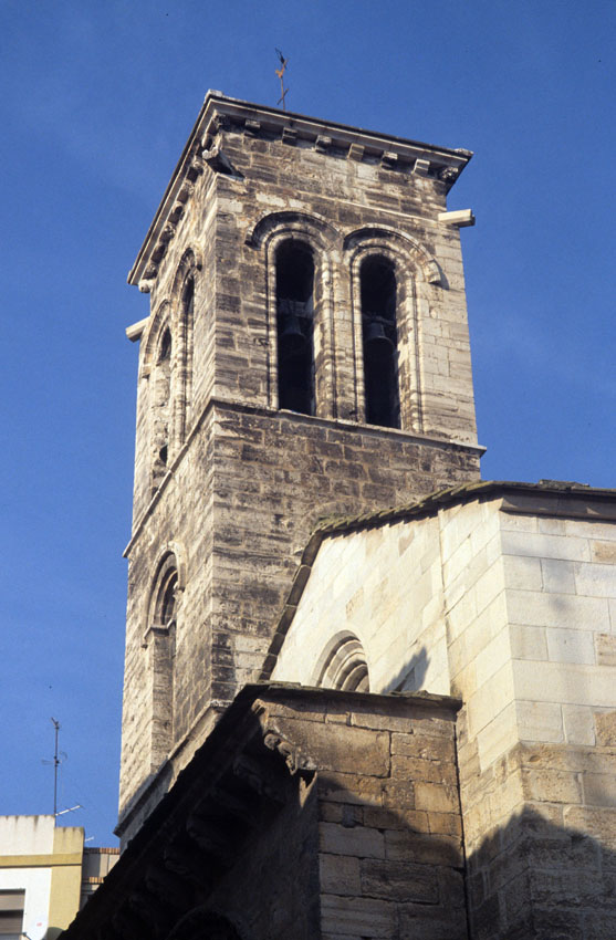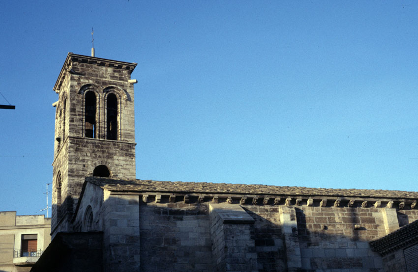 Detalle de la fachada y torre de la Iglesia de la Magdalena de Tudela (Navarra).