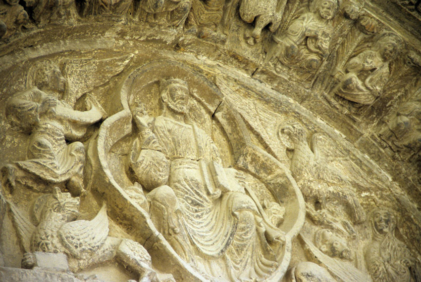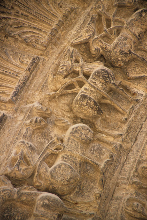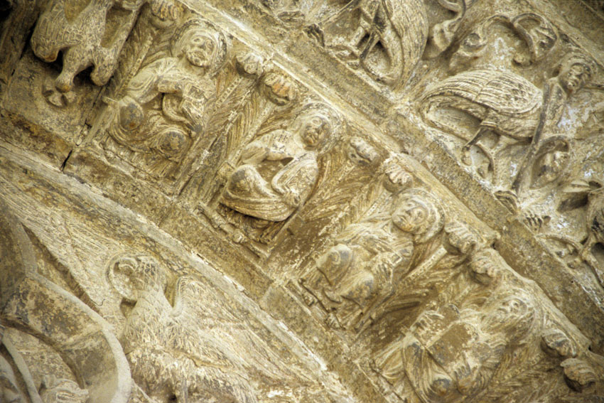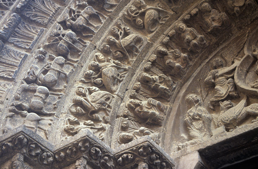 Detalle del tímpano de la portada principal de la Iglesia de la Magdalena de Tudela (Navarra).