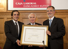 El Palacio Miramar de Donostia acogió el 8 de noviembre la ceremonia de entrega del Premio Eusko Ikaskuntza-Caja Laboral de Humanidades, Cultura, Artes y Ciencias Sociales 2012 al pensador y escritor Joxe Azurmendi Otaegi (Zegama, 1941). Junto con los presidentes de las entidades otorgantes del galardón, Iñaki Dorronsoro y Txomin García Hernández, el acto contó con la intervención de representantes de las siete universidades que participan en el jurado, quienes glosaron las distintas facetas del premiado. Así, Iosu Zabala (Universidad de Mondragón) habló de su aportación académica; Charles Videgain (Universidad de Pau) inscribió a Azurmendi en el contexto del pensamiento europeo; de su obra poética se ocupó Iñaki Esparza (UNED) y de la ensayística Jesús María Pintor (Universidad Pública de Navarra); el compromiso con la cultura centró la intervención de Gabriel Insausti (Universidad de Navarra); finalmente, Roberto San Salvador (Universidad de Deusto) e Iñaki Goirizelaia (Universidad del País Vasco) abordaron la producción intelectual de Azurmendi y su labor en favor del euskera.