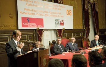 Bajo la presidencia del Lehendakari Juan José Ibarretxe, el 14 de octubre se celebró en Donostia la ceremonia de entrega del Premio Eusko Ikaskuntza-Caja Laboral de Humanidades, Cultura, Artes y Ciencias Sociales 2008 al filósofo Daniel Innerarity. Además del Lehendakari y del premiado,en el acto tomaron la palabra el Diputado General de Gipuzkoa, Markel Olano, los Presidentes de Eusko Ikaskuntza y Caja Laboral, así como representantes de las siete universidades que intervienen en la concesión del Premio. Javier Retegui, Presidente de Eusko Ikaskuntza, definió al premiado como "uno de los grandes pensadores actuales", así como "un intelectual en pleno desarrollo, con una potente obra en marcha y con una enorme proyección futura". Juan M? Otaegi señaló que el pensamiento de Innerarity es "una puerta abierta a la necesidad de cambios profundos". En este sentido el Presidente de Caja Laboral lamentó que, en un mundo atrapado en la inmediatez, apenas haya espacio para reflexionar sobre el futuro.